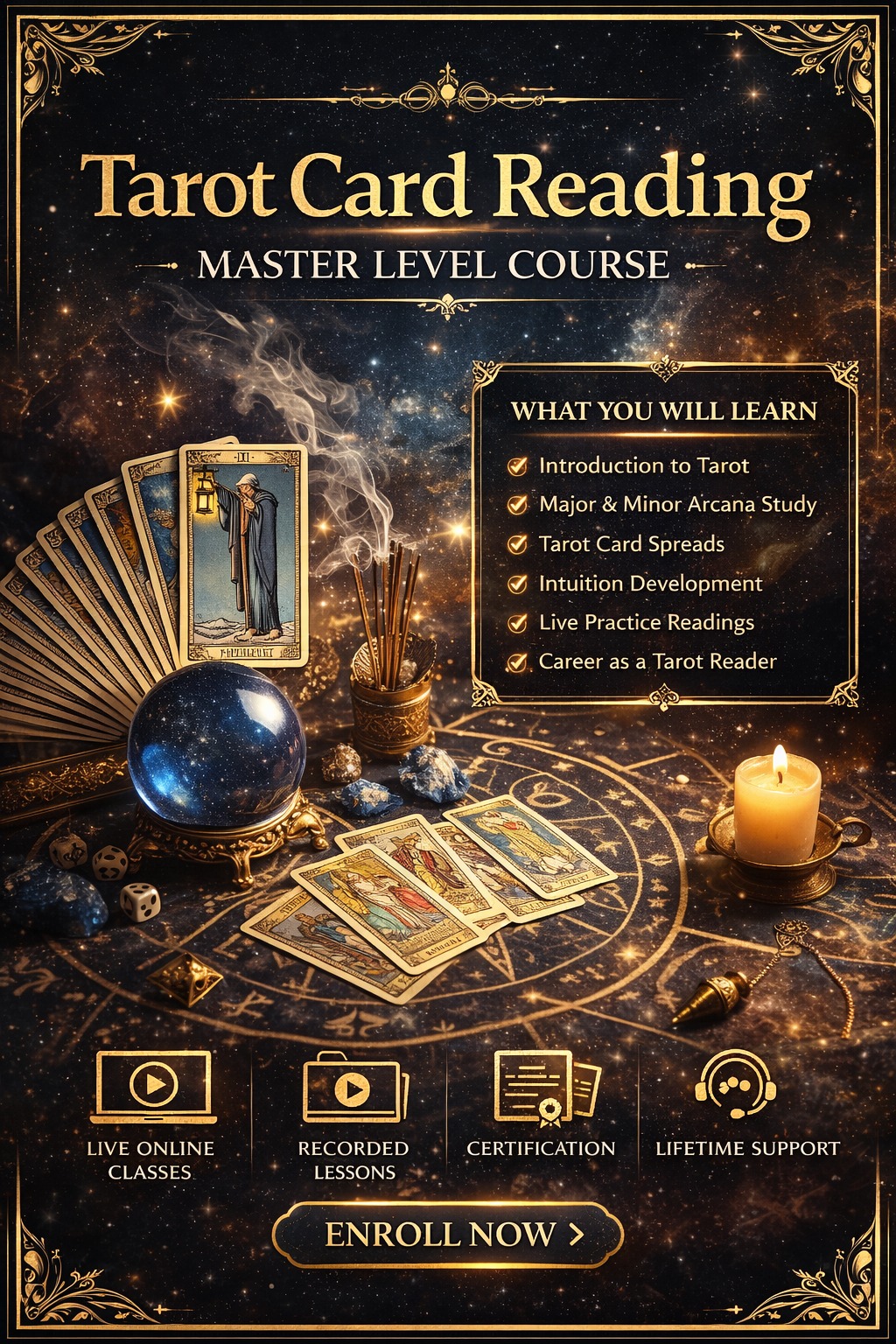 The Tarot Card Reading Master Level Course is a structured professional training program designed for individuals who wish to master tarot reading from foundation to advanced level. The course combines theoretical knowledge, intuitive development, practical exercises, and real reading practice to help students become confident tarot readers.